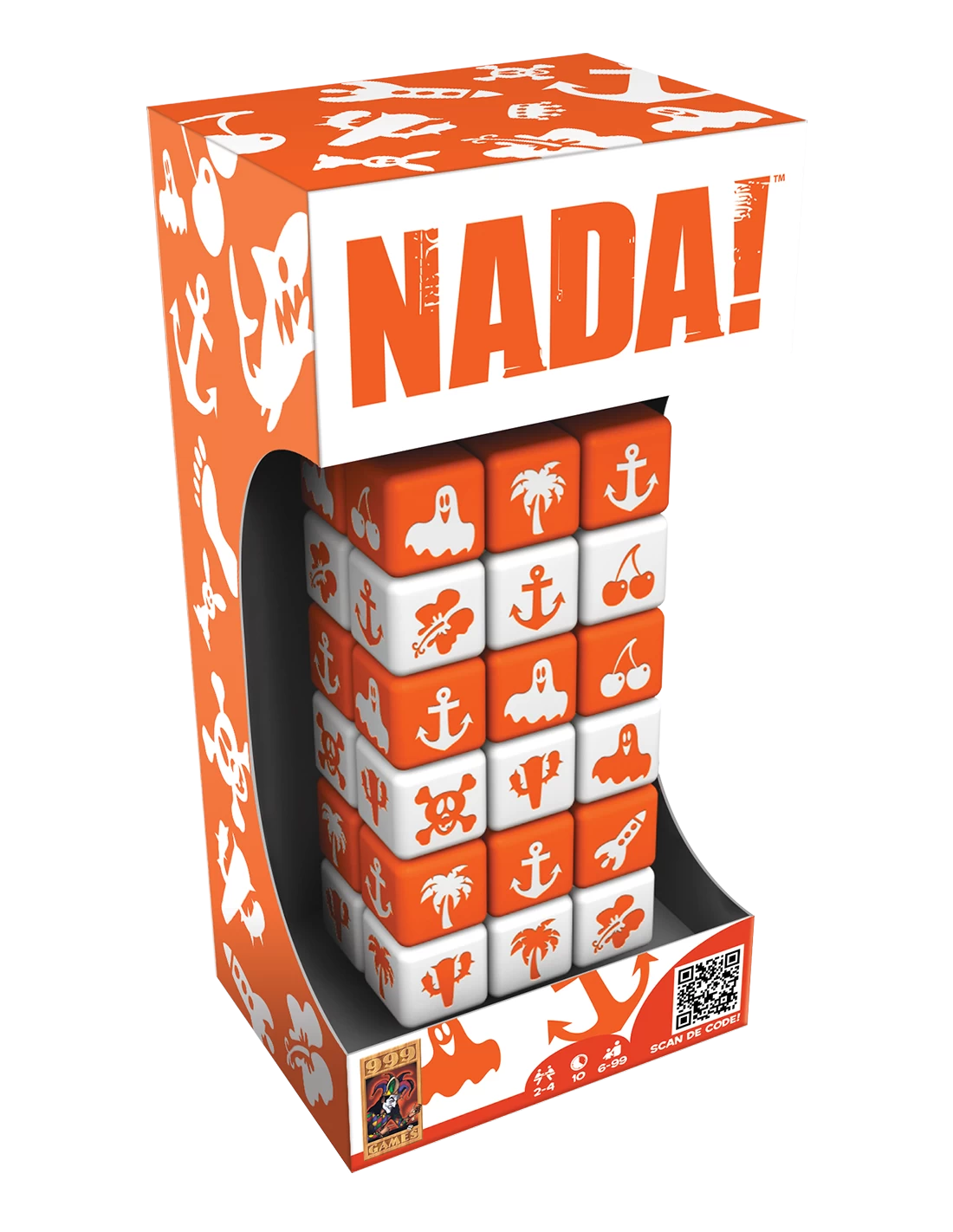 In each round, you start by taking six white dice and six orange dice, with each die having six different symbols on it. Someone rolls all the dice in the center of the table, then players race to be the first to yell out a symbol that is on at least one white and one orange die. If correct, the player collects all the dice showing this symbol; if not, the player collects nothing and sits out the next turn. Once a player has claimed dice, this player rerolls all the remaining dice. If no match can be found, the first player to yell “Nada!” and cover the dice with her hand claims all the remaining dice. Players tally their scores – one point for each die collected – then play another round. Whoever has the highest score after three rounds wins!