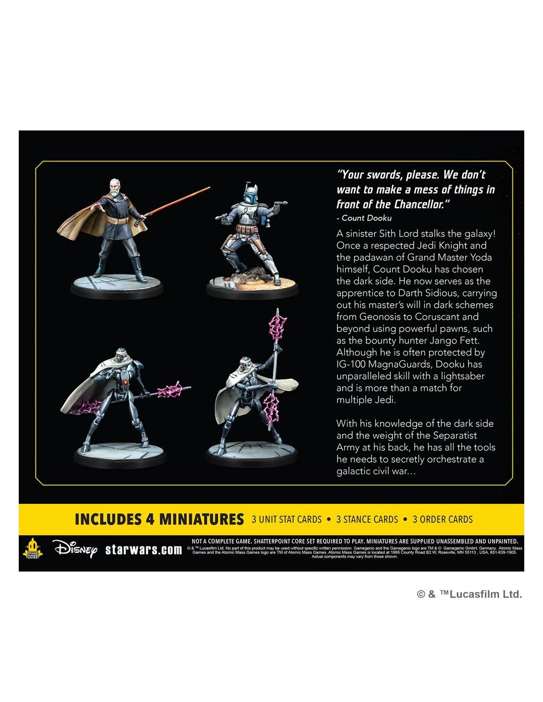 A sinister Sith Lord and his minions enter the duels of Star Wars: Shatterpoint! Once a respected Jedi Knight and the padawan of Grand Master Yoda himself, Count Dooku has chosen the dark side, now serving as the apprentice to Darth Sidious himself. This pack adds a new squad of Count Dooku, Jango Fett, and 2 IG-100 MagnaGuards to Star Wars: Shatterpoint that players can play right away or use alongside other characters to create their own custom squad. In addition to the beautifully sculpted miniatures of all four characters, players will also find the all the cards they need to bring these characters to life on the tabletop.