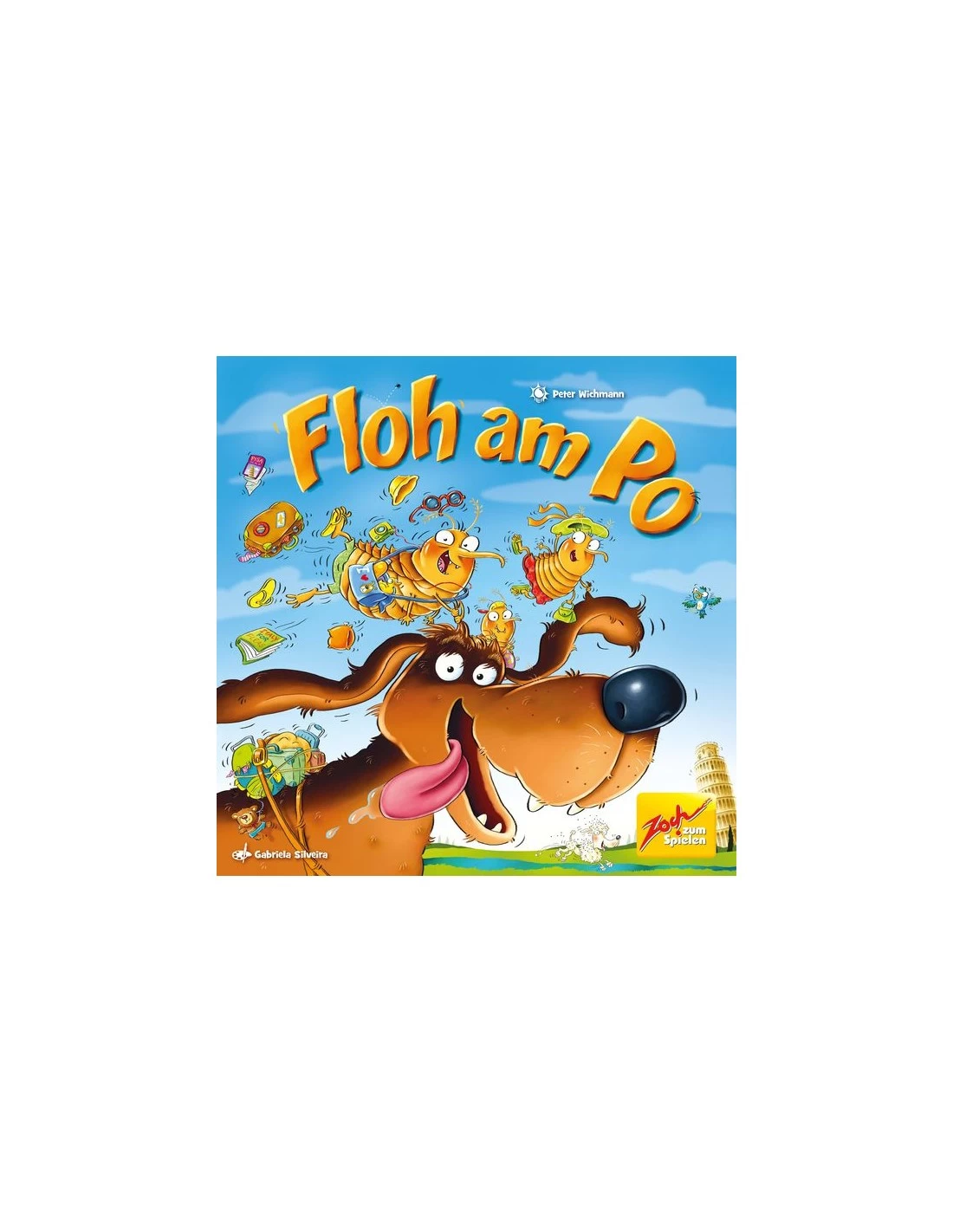 Floh am Po is a vacation-themed kids’ roll-and-move game of fleas clinging tightly to the fur of big wooden dogs (thanks to Velcro).