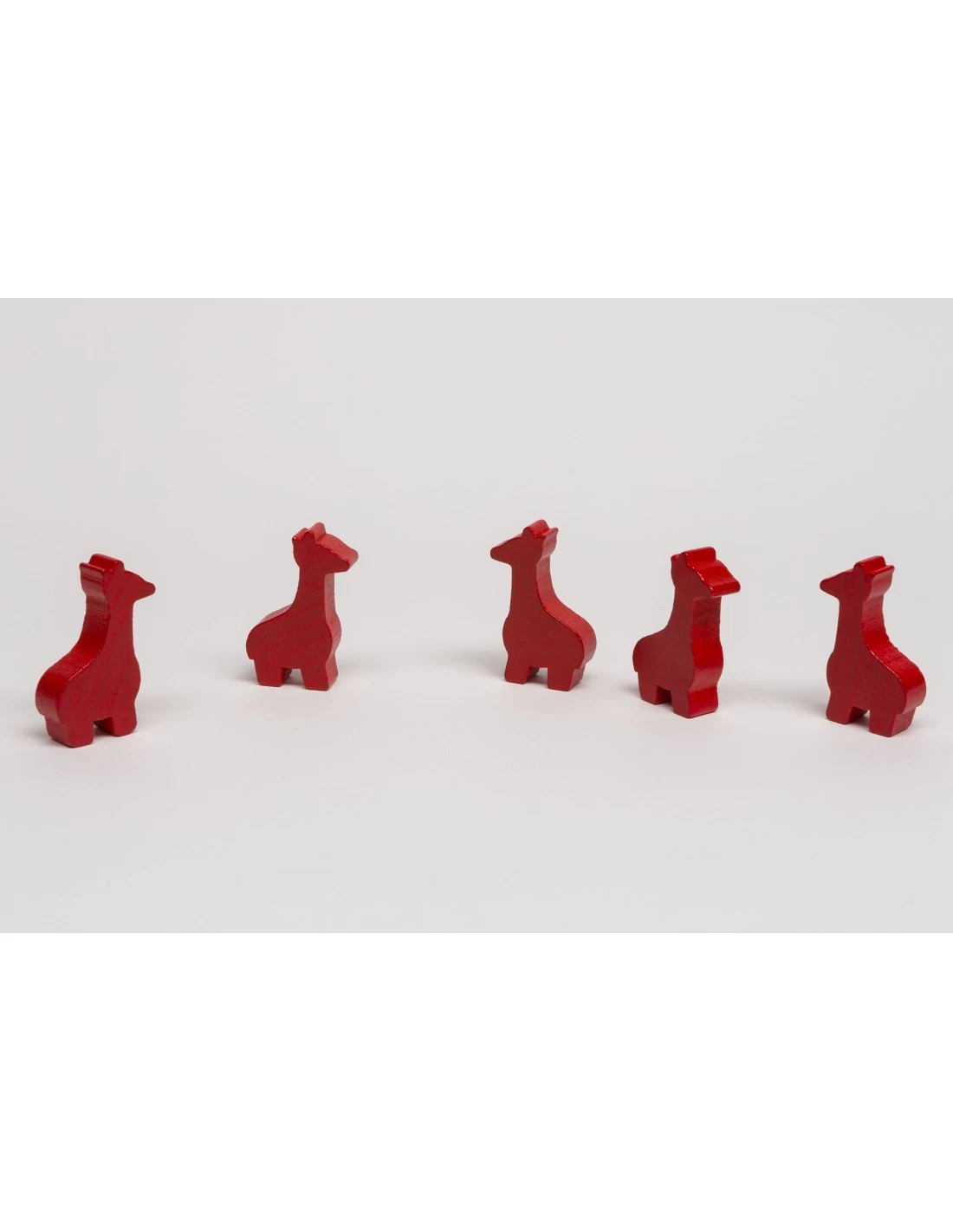 Roodgekleurde giraf van hout. Het dier is ca. 4 cm hoog, 3 cm breed en 1 cm dik.