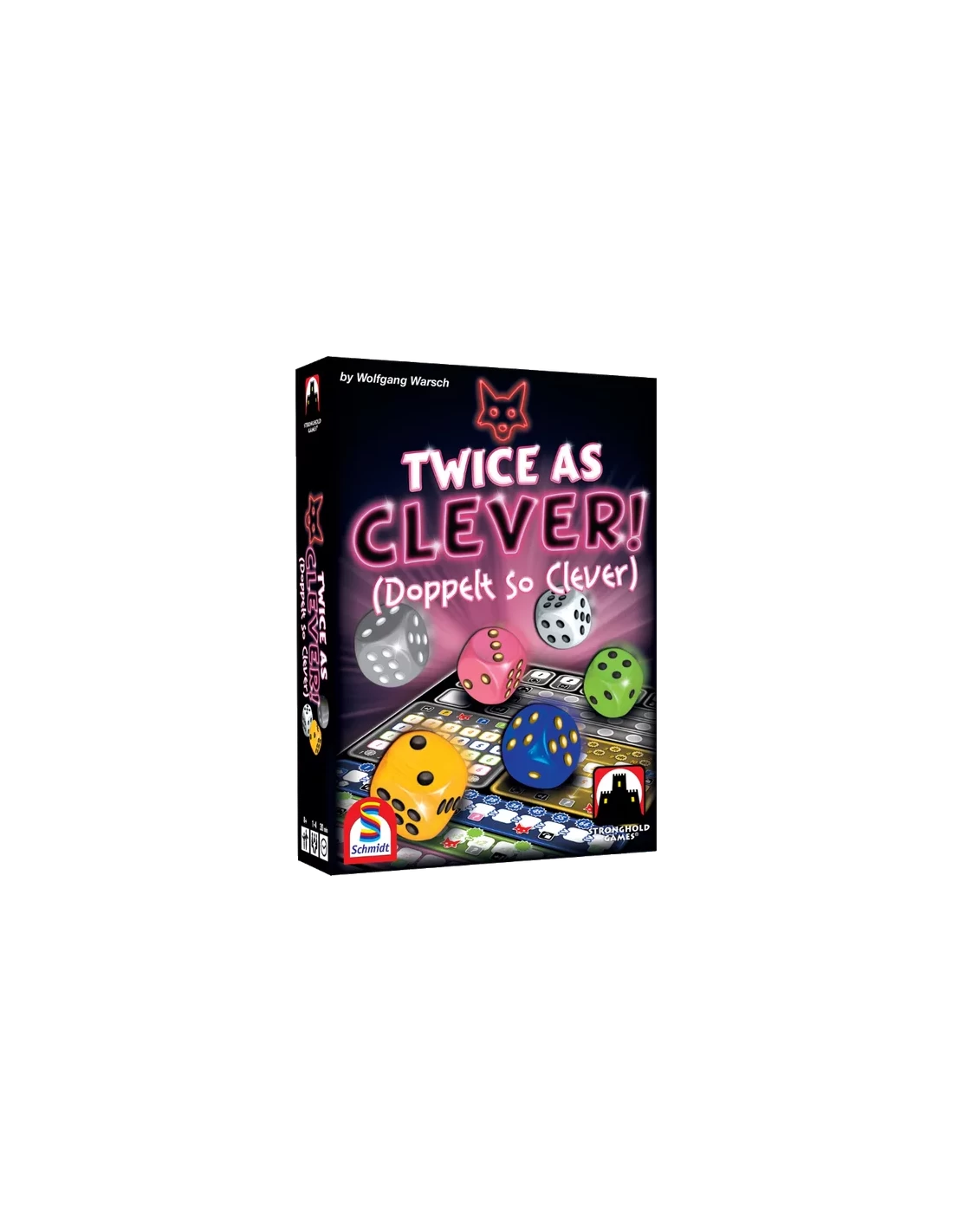 Doppelt so clever follows the model of 2018’s Ganz schΓΆn clever. Each turn the active player rolls six dice, chooses one of them to mark off a space on their scoring grid, places any dice with lower numbers aside, then re-rolls any remaining dice. The white die is a joker and can be used as any one of the other five colors. After the active player chooses at most three dice, then the other players each choose one of the set-aside dice for use on their scoring sheet.
